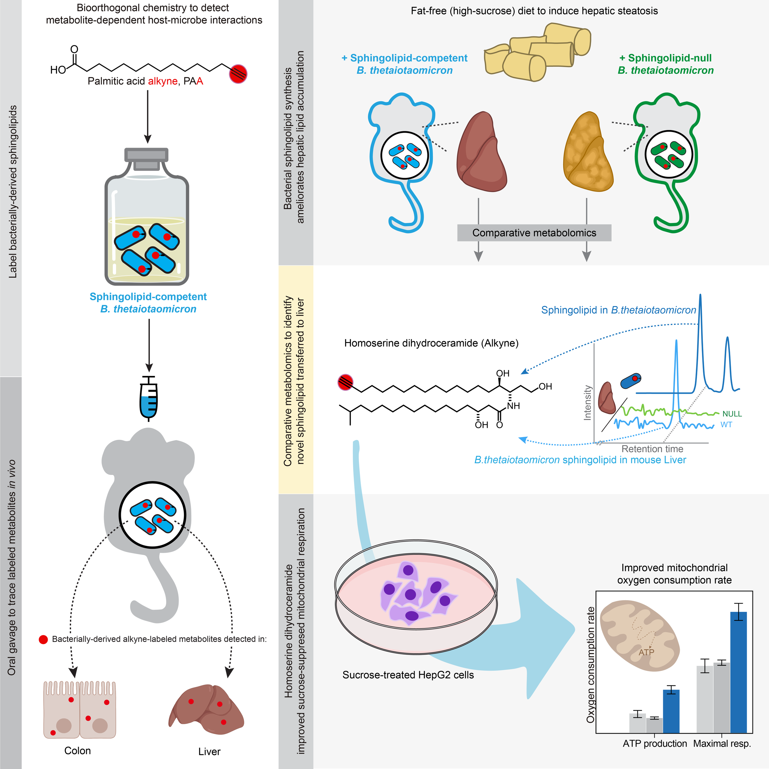 Congratulations to co-first authors Henry and Min-Ting for their work on characterizing sphingolipids that transfer from the microbiome to host and determining that bacterial sphingolipid synthesis can reverse hepatic steatosis through multiple mechanisms. Congrats to Kevin for his integral support on the biochemical and phenotype work. This paper also details methods for investigating metabolite mediated host-microbe interactions using bioorthogonal chemistry.